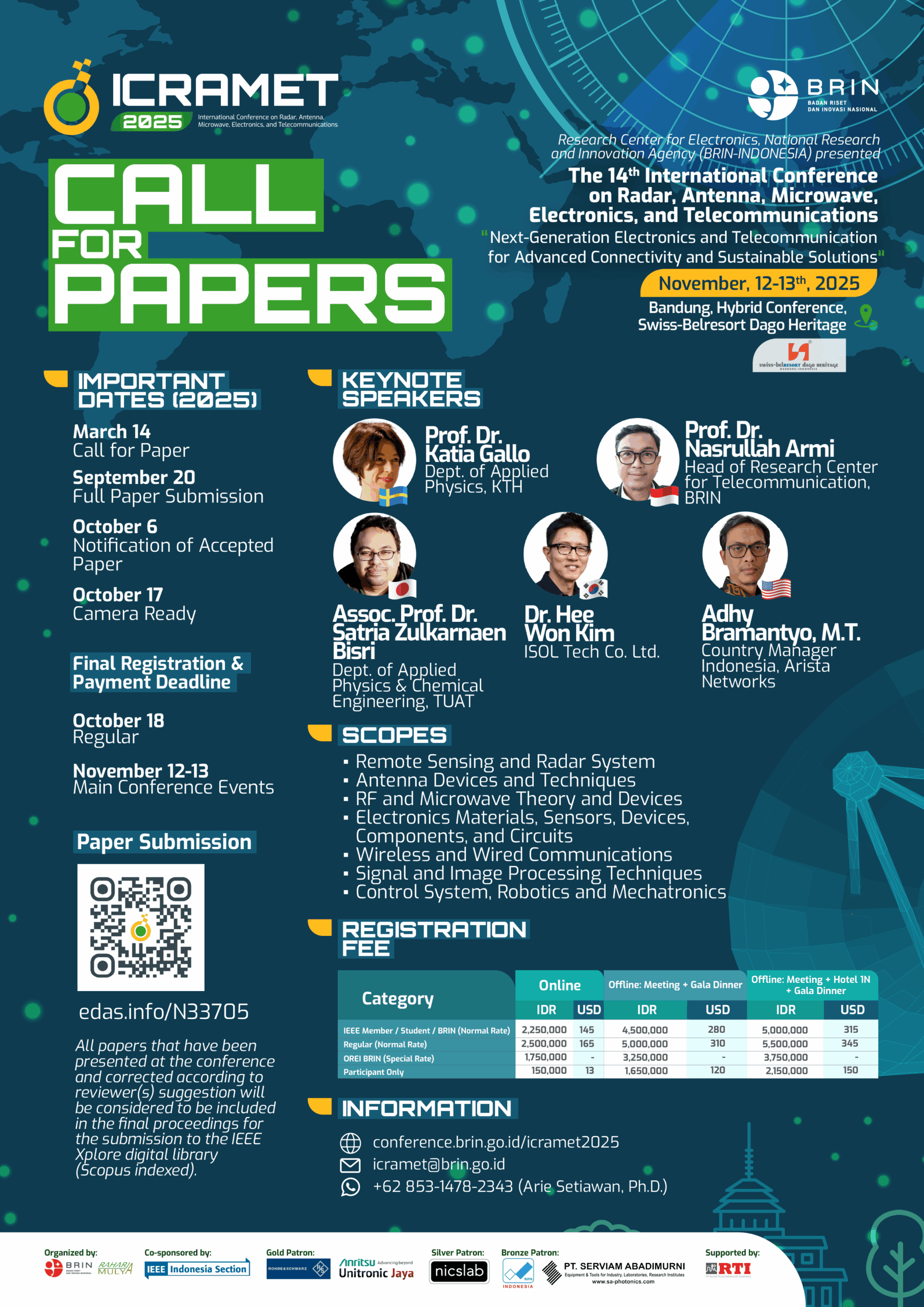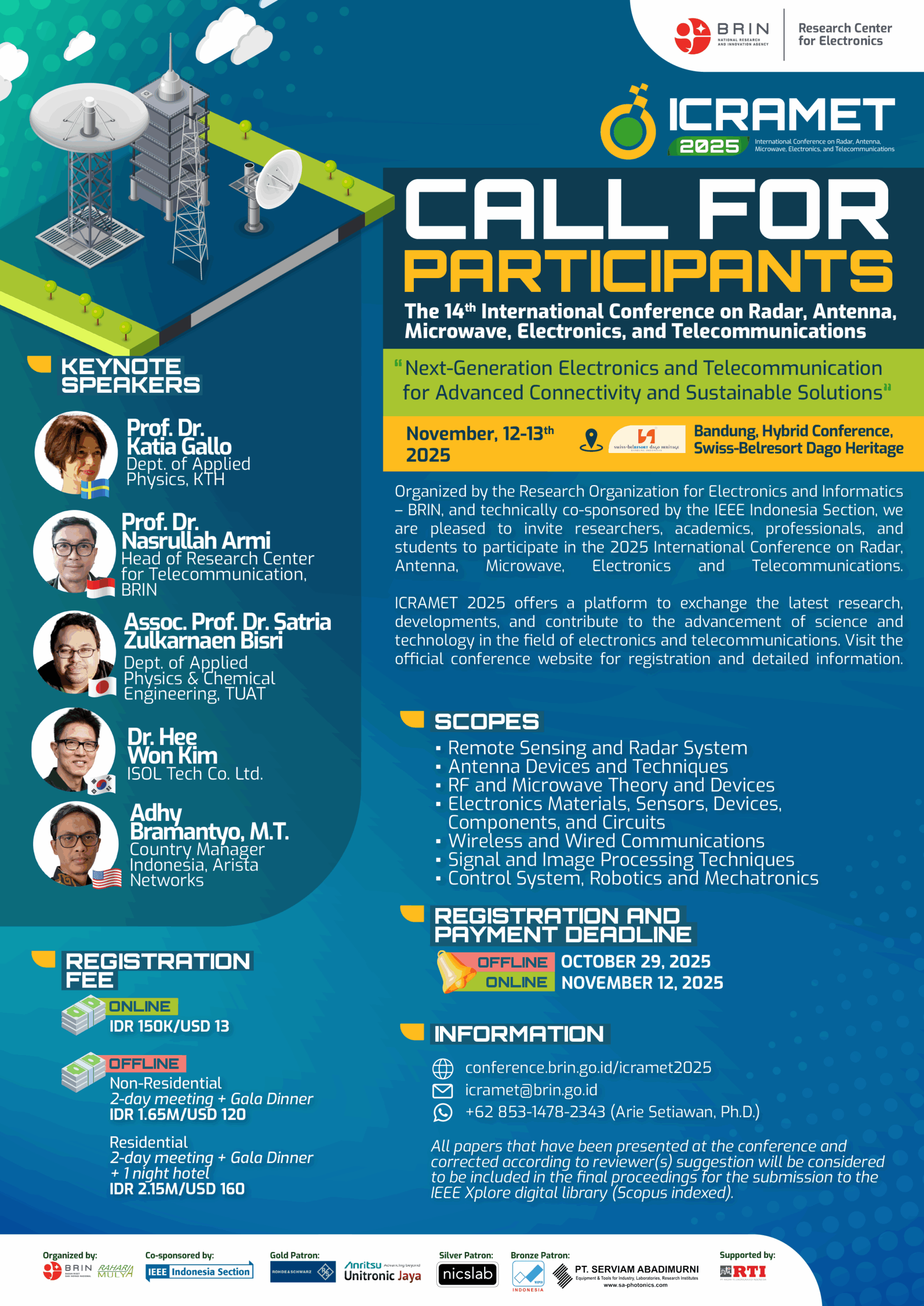 Join us at The 2025 International Conference on Radar, Antenna, Microwave, Electronics and Telecommunications (ICRAMET) on November 12–13, 2025, from Bandung, Indonesia and online to connect, collaborate, and contribute to the advancement of science and technology in the field of electronics and telecommunications.