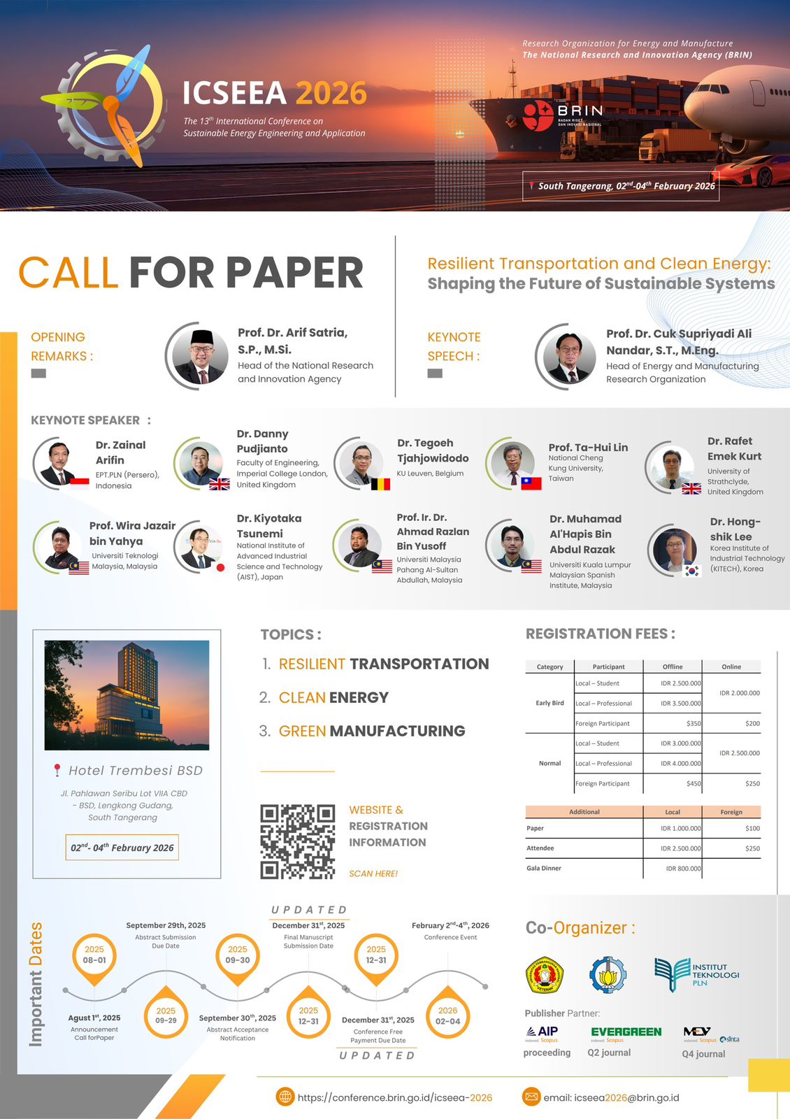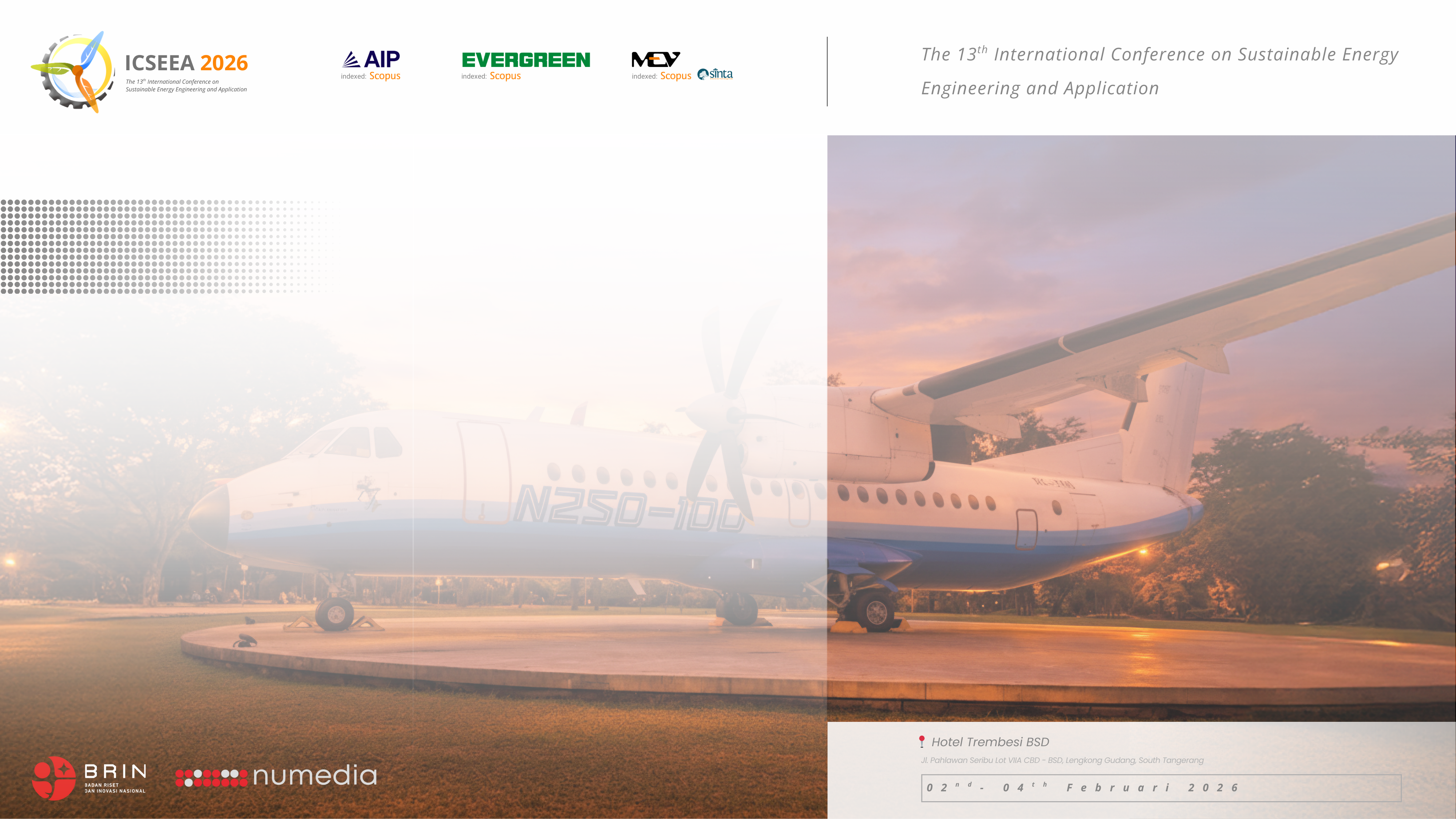 Research Organization for Energy and Manufacture, National Research and Innovation Agency (BRIN), is proud to present the 13th International Conference on Sustainable Energy Engineering and Applications (ICSEEA 2026). This conference will be held on a hybrid basis with online and offline presentations from 2nd to 4th February 2026 at Hotel Trembesi BSD, South Tangerang. ICSEEA 2026 brings together researchers, policymakers, experts, and industry leaders from around the world to share insights and innovations on resilient transportation, clean energy, green manufacturing, and sustainable systems.