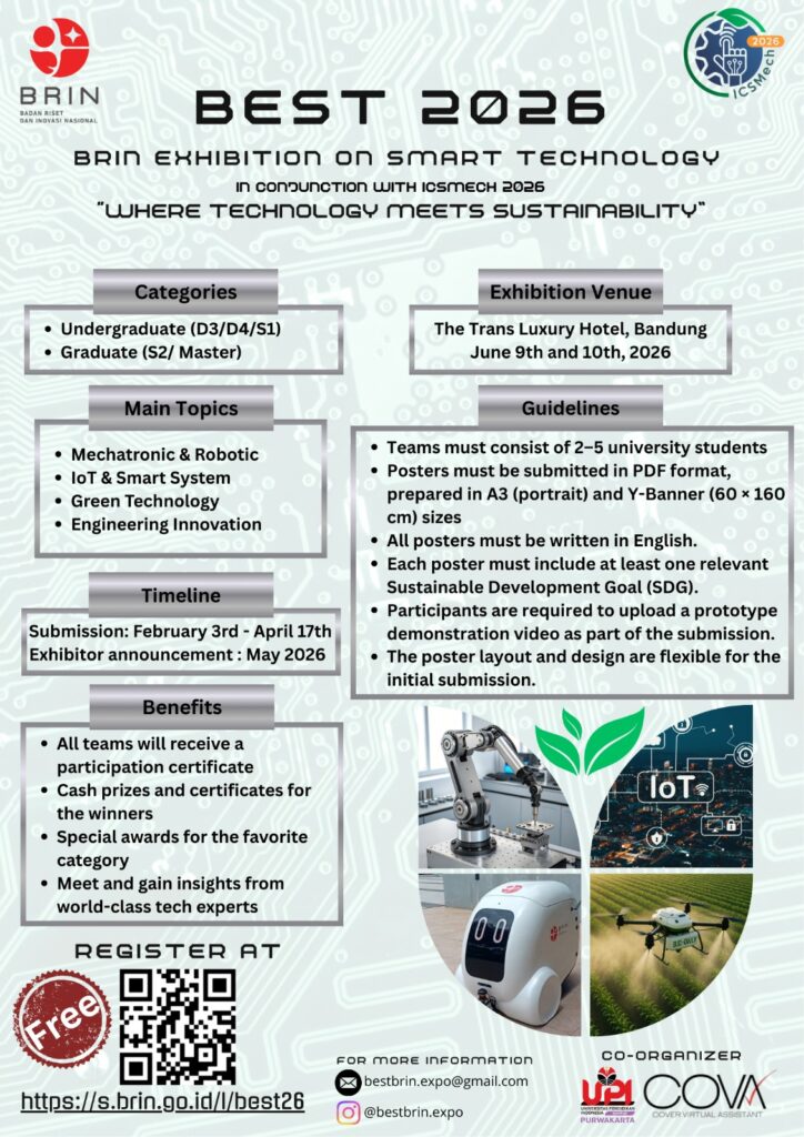 BRIN Exhibition on Smart Technology (BEST) 2026, organized by the Research Center of Smart Mechatronics, National Research and Innovation Agency (BRIN) and co-organized by COVA Indonesia and Universitas Pendidikan Indonesia (Purwakarta Campus) is a competitive innovation exhibition that brings together university students to develop impactful solutions for real-world challenges.